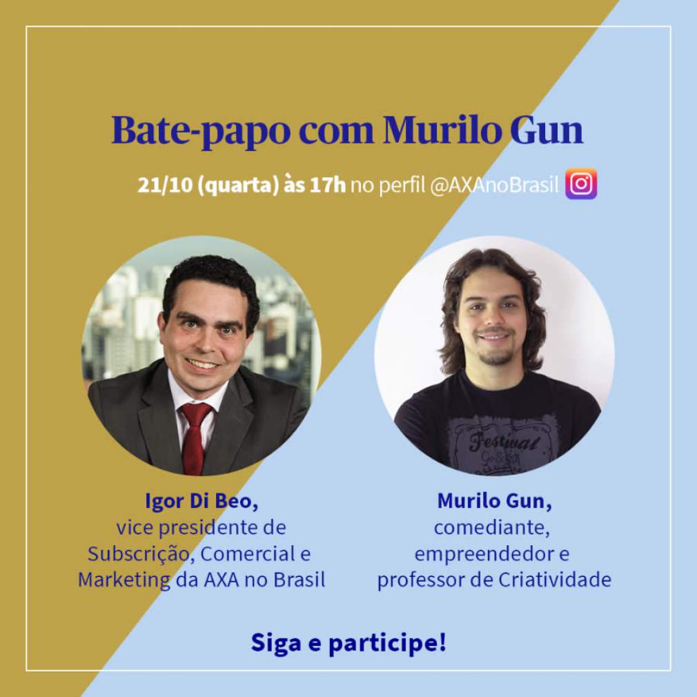 A AXA no Brasil vai promover, no dia 21/10 às 17h, uma live especial para celebrar o mês do corretor, tendo como convidado empreendedor e professor de Criatividade Murilo Gun. Com um formato leve e divertido, a live será um bate papo entre Murilo e Igor Di Beo, vice-presidente Comercial, Marketing e Subscrição da companhia, para falar de temas como coragem e habilidades do futuro, sejam pessoais ou profissionais. Para acompanhar a conversa, basta acessar o Instagram @axanobrasil.