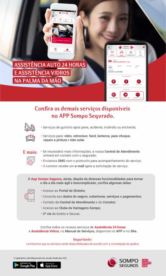 Dados da Sompo Seguros indicam que, cada vez mais, segurados Sompo Auto recorrem ao recurso mobile. Serviços de mecânico ou guincho após pane representam 79% dos acionamentos, enquanto que os demais 21% são para reparo ou troca de vidros, retrovisor, farol, lanterna, para-choque, reparo a pintura e teto solar e martelinho de ouro