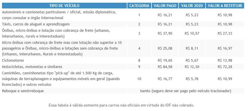 O valor do Seguro DPVAT é definido por tipos de veículos e, por isso, os proprietários que pagaram neste ano com os valores referentes a 2019 têm direito a restituição com valores distintos. Conheça abaixo os reembolsados em cada uma das categorias.