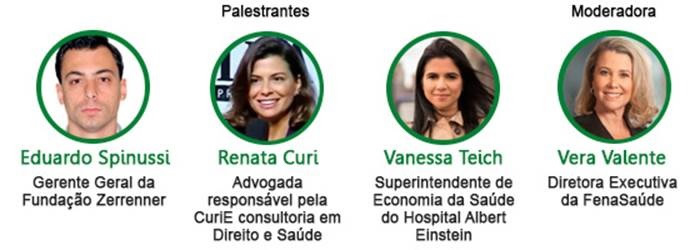 Vanessa Teich, superintendente de Economia da Saúde do Hospital Albert Einstein; Renata Curi, advogada responsável pela CuriE consultoria em Direito e Saúde; e Eduardo Spinussi, gerente geral da Fundação Zerrenner (Instituição acionista e co-controladora da Ambev e Itaúsa), irão discutir possibilidades para novos modelos de negociação na Saúde Suplementar, levando em consideração as premissas necessárias à implantação de estratégias como compartilhamento de riscos e incorporação condicionada.