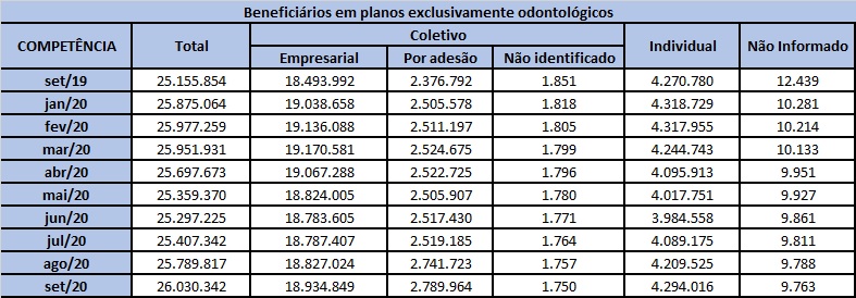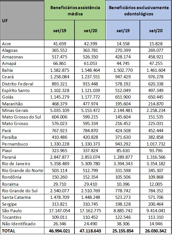 A Agência Nacional de Saúde Suplementar (ANS) atualizou os números de beneficiários de planos de saúde relativos ao mês de setembro. No período, o setor totalizou 47.118.643 usuários em planos de assistência médica e 26.030.342 em planos exclusivamente odontológicos em todo o Brasil.