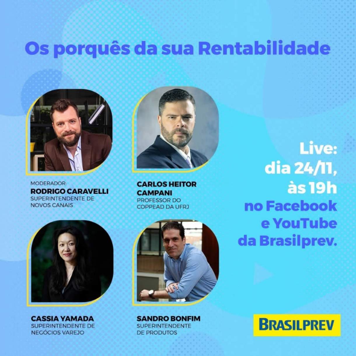 O moderador da conversa será Rodrigo Caravelli, superintendente de Novos Canais da Brasilprev, que receberá como convidados o professor Carlos Heitor Campani, do COPPEAD da UFRJ, a Cassia Yamada, superintendente de Negócios Varejo e Sandro Bonfim, superintendente de Produtos.