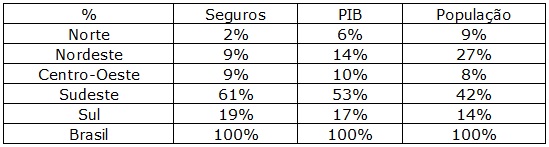 Por exemplo, a região Nordeste possui 27% da população, 14% do PIB e apenas 9% da receita de seguros.