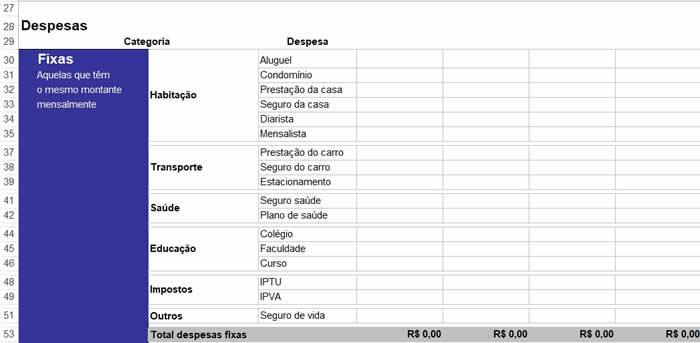 A planilha também pode ser organizada por categoria como moradia, alimentação e transporte. É importante projetar também as despesas anuais como IPVA, IPTU e rematrículas, para não ser pego de surpresa. Quanto mais detalhada, melhor o controle financeiro.