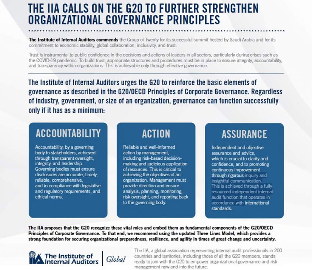 Maior entidade de auditoria interna do mundo lança comunicado à cúpula do G20 com o objetivo de alertar os países membros sobre a importância de reestimular o comprometimento com os princípios de governança em todos os setores