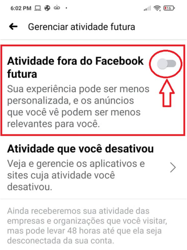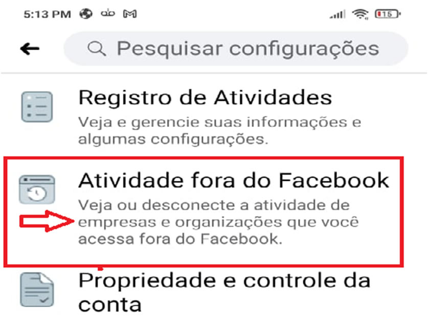 5) Em Configurações da conta, descubra a " Atividade fora do Facebook" e toque ali.