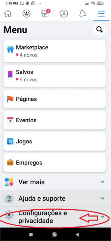 3) Em Menu, se dirija para o final da página e visualize as "Configurações e Privacidade", e clique ali.