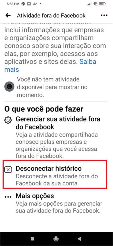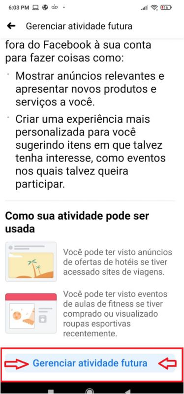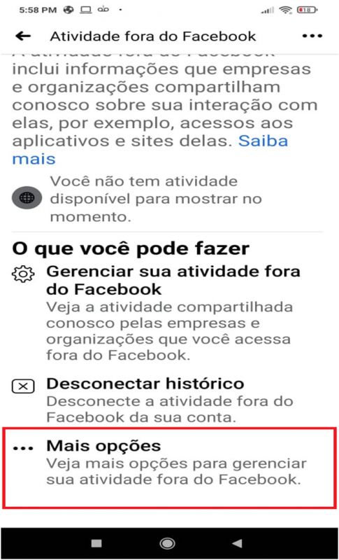 7 A) Em seguida, volte uma página para "Mais Opções". Gerenciar atividade Futuras. Novamente em "Gerenciar atividades futuras" Tire a permissão de "Atividade fora do Facebook Futura". Portanto, tire a permissão.