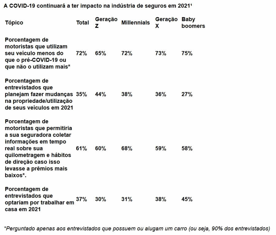 Os millenials são a geração mais predisposta a compartilhar informações em tempo real sobre sua quilometragem e hábitos de direção se isso levasse a prêmios mais baixos, enquanto os baby boomers estão mais dispostos a trabalhar de casa ao longo deste ano