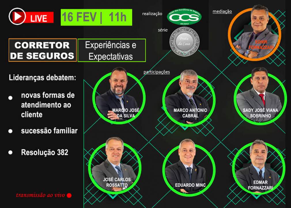 Em mais uma edição da série Prata da Casa, o Clube dos Corretores de Seguros de São Paulo (CCS-SP) realizará no dia 16 de fevereiro, a partir de 11h, a live “Corretor de Seguros – Experiências e Expectativas”. Sob a mediação do secretário Ednir Fornazzari, o evento contará com a participação de seis associados do CCS-SP, que ocupam posições de lideranças regionais da corretagem de seguros em São Paulo.