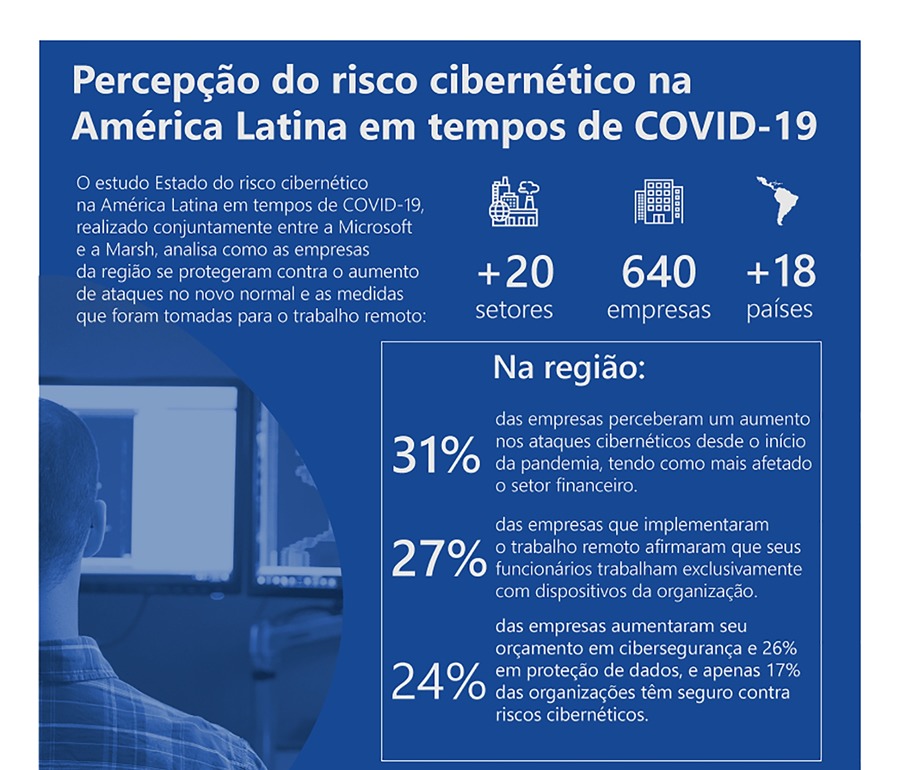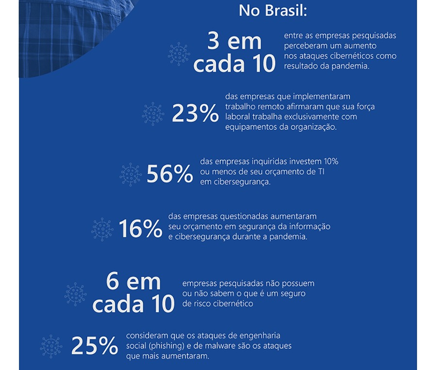 De acordo com o estudo Percepção do Risco Cibernético na América Latina em tempos de COVID-19, realizado pela Marsh a pedido da Microsoft, apenas 16% das empresas entrevistadas aumentaram seu orçamento em segurança da informação e cibersegurança durante a pandemia. Com o baixo investimento, 30% das empresas questionadas afirmaram ter percebido um aumento nos ataques como resultado da pandemia; entre as principais ameaças, 25% consideraram que os ataques de engenharia social (phishing) e os ataques de malware são os que mais aumentaram; outras 24% mencionaram os ataques a aplicativos web.
