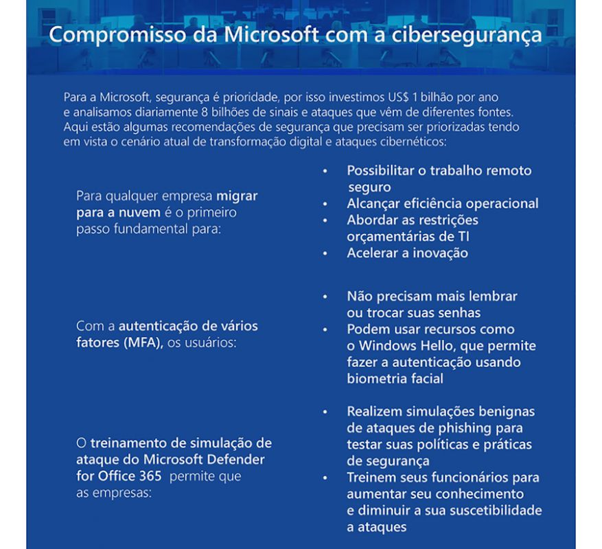 Para qualquer empresa, migrar para a nuvem é o primeiro e importante passo para possibilitar um trabalho remoto seguro, alcançar a eficiência operacional, lidar com restrições orçamentárias de TI e acelerar a inovação. A Microsoft oferece uma abordagem única com ferramentas nativas da nuveme um só provedor, o que proporciona um novo nível de integração que leva às empresas o melhor dos dois mundos: visibilidade total de todos os seus recursos e alertas inteligentes criados com um profundo conhecimento dos recursos individuais, aprimorados com inteligência humana e mecânica.