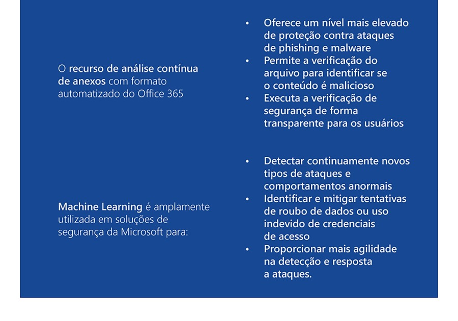 Machine Learningé amplamente utilizada em soluções de segurança da Microsoft para detectar continuamente novos tipos de ataques e comportamentos anormais, identificar e mitigar tentativas de roubo de dados ou uso indevido de credenciais de acesso, além de proporcionar mais agilidade na detecção e resposta a ataques.