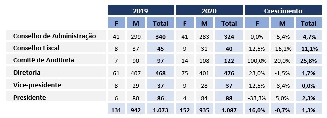 A análise detalhada dos dados ainda mostra que, no Grupo Caixa Econômica, houve a substituição em três cargos. A redução foi parcialmente compensada pela conquista por uma executiva do cargo de presidente da Brasilprev.