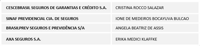 De acordo com dados obtidos no Sistema de Estatísticas da Susep, em dezembro de 2020 as empresas de seguros que tinham executivas ocupando os cargos de CEO eram:
