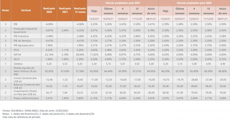 A mediana das estimativas para o crescimento do PIB ao final de 2021 recuou pela segunda semana seguida, de 3,26% para 3,23%. Há um mês, as projeções indicavam uma expansão de 3,43%