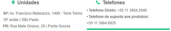 Telefone Direto: +55 11 3664-2040 | Telefone exclusivo para suporte aos produtos: +55 11 3192-8925