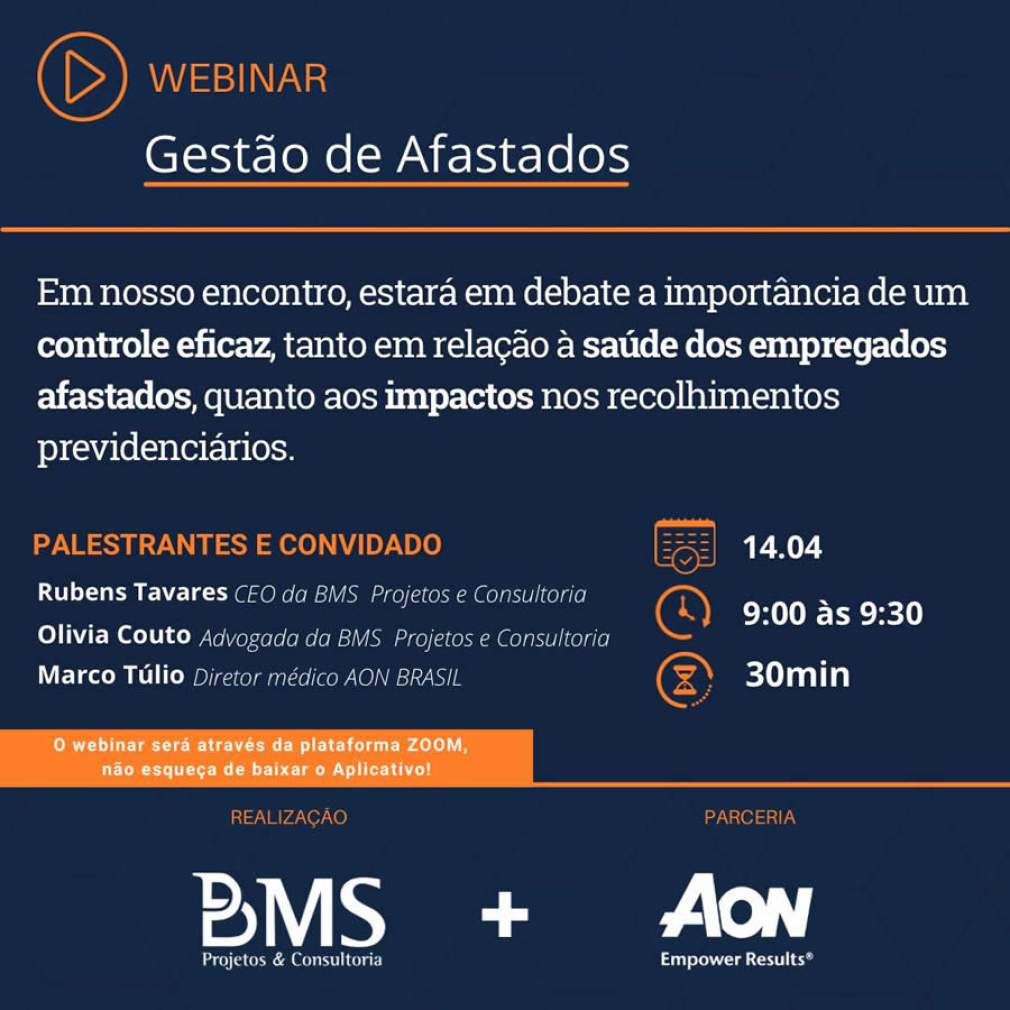 Em tempos de pandemia, as empresas vivem um desafio sem precedentes na gestão de pessoal: enquanto buscam enxugar seus gastos, os acidentes de trabalho têm provocado custos diretos e indiretos em escala crescente. O esforço para redução de despesas pode ser em vão sem um controle eficaz da saúde dos funcionários afastados e dos impactos na folha de pessoal. A importância de uma boa Gestão de Afastados será tema de Webinar no próximo dia 14, às 9h, reunindo a BMS Projetos & Consultoria e a AON Brasil – líder nos serviços de consultoria em gestão de riscos e seguros.