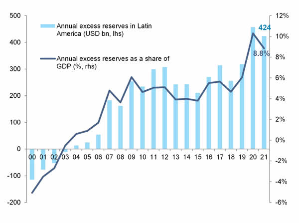 Essas reservas são usadas como proteção contra a volatilidade e os ataques especulativos, e têm sido a maneira da América Latina se precaver das desvantagens da liberalização financeira. Como resultado, toda região tornou-se menos vulnerável as crises financeiras que ocorreram entre os anos 1970 e 1990 (com exceção de Venezuela, Argentina e Equador).