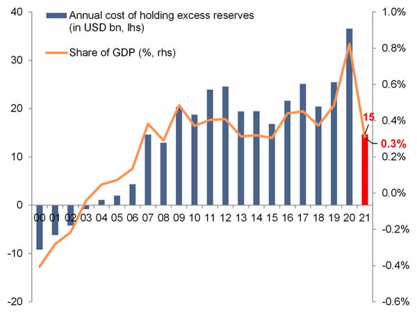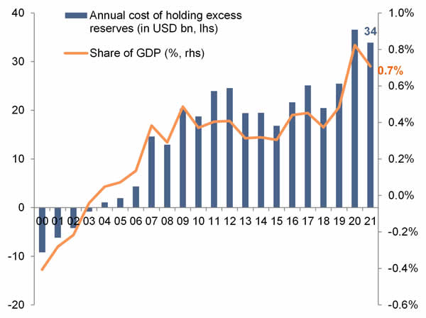 No entanto, a economista Patrícia Romero, aponta que “os bancos centrais que detêm tais reservas em títulos do Tesouro dos EUA de baixo rendimento podem não estar empregando-as da maneira mais eficiente: estimamos que o custo oportunidade de não usar essas reservas para investimentos mais produtivos foi de, em média, 0,4% do PIB a cada ano nos últimos 15 anos, e pode subir para 0,7% do PIB ou 34 bilhões de dólares em 2021”, explica (Figura 02).