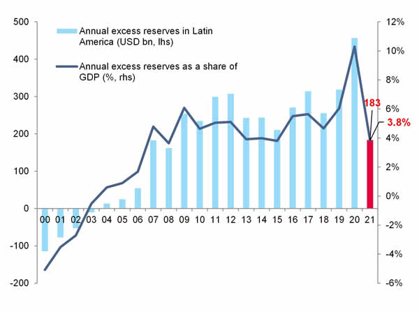 Economistas da seguradora de crédito mostram que a maior parte das reservas excedentes estão com Brasil, México e Peru