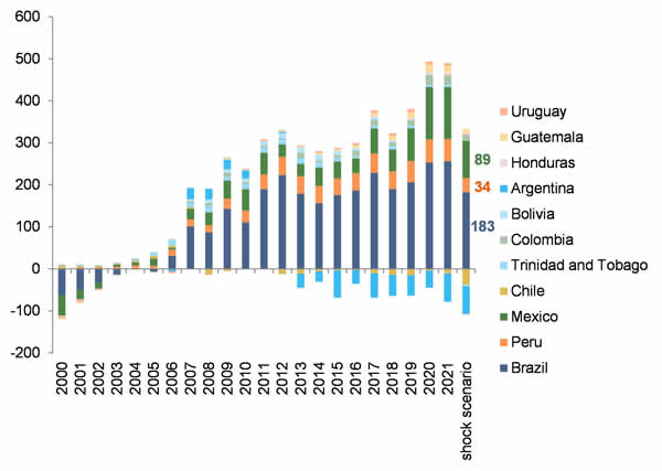 Figura 5: Cenário adverso / de choque: “Excesso” de reservas cambiais na América Latina, por país (amostra de 11 países em 35, USDbn)