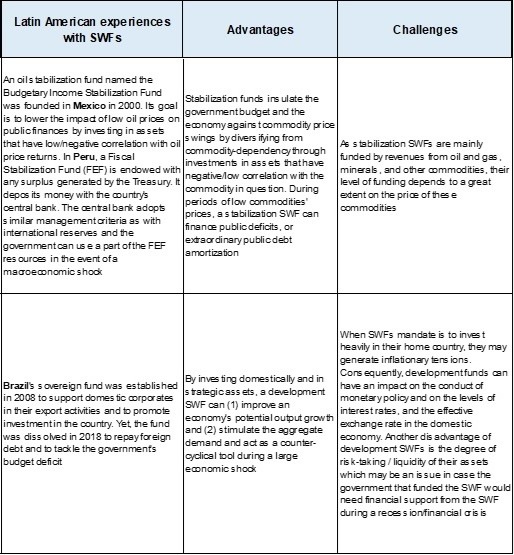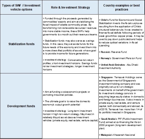 O estudo também aponta que usar os Fundos de Riqueza Soberanos para “estabilização” (destinada a isolar o orçamento e proteger contra a volatilidade dos preços das commodities) e “desenvolvimento” (para ajudar a financiar projetos ou políticas industriais que aumentem a produção econômica) faria sentido (Figura 6). Isto implicaria em uma estratégia de investimento mais agressiva a longo prazo (carteira de maior rendimento) e uma mobilização de recursos para financiar o investimento em infraestrutura ou outras políticas estruturais.