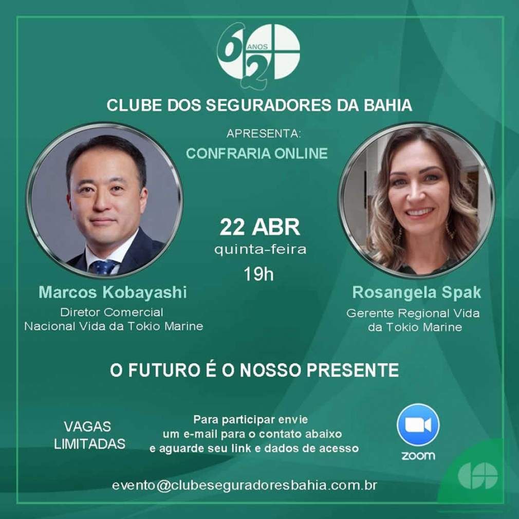 Com objetivo de dar continuidade à interação dos associados com os executivos das seguradoras, a Confraria Online do Clube dos Seguradores da Bahia planejou uma nova transmissão, que acontece no dia 22 de abril, às 19 horas, com o tema “O futuro é o nosso presente”. Os convidados serão os executivos da Tokio Marine, Rosangela Spak, Gerente Regional Vida e do Diretor Comercial Nacional Vida e Presidente do Clube de Vida em Grupo de São Paulo – CVG-SP, Marcos Kobayashi.