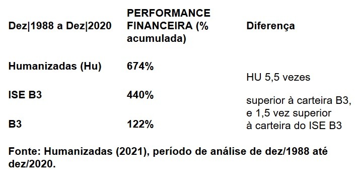 Na prática, analisando todas as empresas listadas na bolsa de valores do país (B3), durante o período de dezembro de 1998 até dezembro de 2020, a pesquisa identificou que as Empresas Humanizadas Brasil – que operam sob um nível de maturidade de liderança e gestão mais evoluído – tendem a ter performances superiores à média da carteira da B3 (5,5 vezes superior) e ao ISE B3 - Índice de Sustentabilidade Empresarial - (1,5 vez superior).