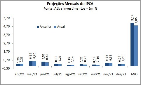 Se o mesmo ocorresse a partir de maio, nossa projeção para o IPCA de 2021 seria reduzida em 30bps, de 5,1% para 4,8%.