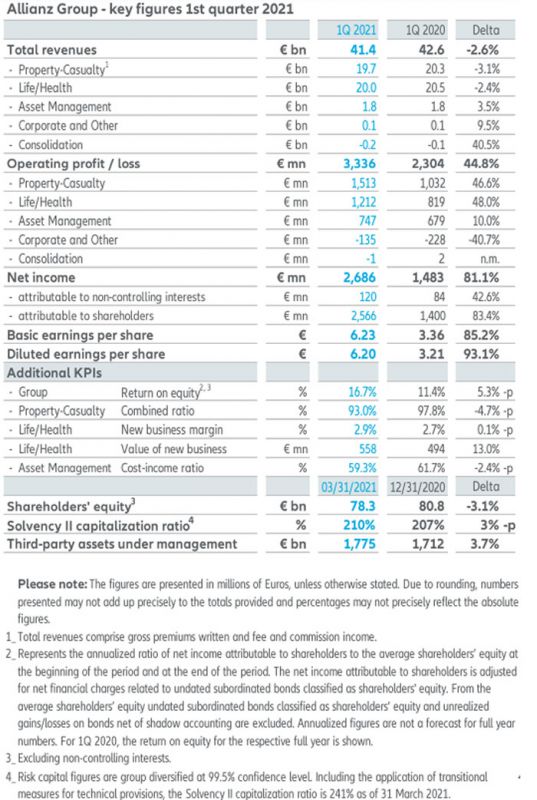 O Lucro Básico por Ação (EPS) aumentou 85,2%, para 6,23 (3,36) euros. O Retorno sobre o Patrimônio Líquido (RoE) anualizado totalizou 16,7% (ano inteiro de 2020: 11,4%). O Coeficiente de Capitalização Solvency II permaneceu em 210%, no fim do 1º trimestre de 2021, comparado aos 207%, no término de 20202.
