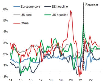 “No curto prazo, os bancos centrais continuarão altamente flexíveis (com algumas exceções, como Noruega, Nova Zelândia e Reino Unido até setembro de 2022). Espera-se que o FED (Federal Reserve System) reduza gradualmente as compras de títulos de 120 bilhões dólares por mês para 0 no segundo semestre de 2023, seguido por um primeiro aumento da taxa no segundo semestre de 2023”, afirma Romero. Para a economista, o BCE (Banco Central Europeu) continuará garantindo condições de financiamento atrativas durante a fase inicial da recuperação, mesmo com a inflação da Zona do Euro, provavelmente, ultrapassando 2,5% no segundo semestre de 2021. Alguns mercados emergentes devem ser uma exceção contra o aumento da inflação, já que a proteção do poder de compra real das famílias continuará sendo o foco em um ambiente de crescentes armadilhas de renda média e risco social.