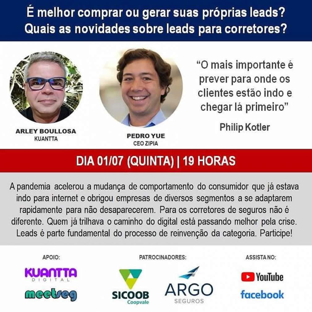 A Kuantta Consultoria promove uma transmissão online que acontece no dia 01 de julho, às 19 horas no canal SEGFLIX, no YouTube, com o tema “É melhor comprar ou gerar suas próprias leads? Quais as novidades sobre leads para corretores?”. Com apresentação do Fundador do Canal SEGFLIX e Sócio da Moby Corretora de Seguros, o evento conta com a participação do CEO da Zipia, Pedro Yue. A transmissão será veiculada no Canal SEGFLIX, no YouTube, através o https://www.youtube.com/channel/UCA_C3Qw1MOihmfDseRvbrSg