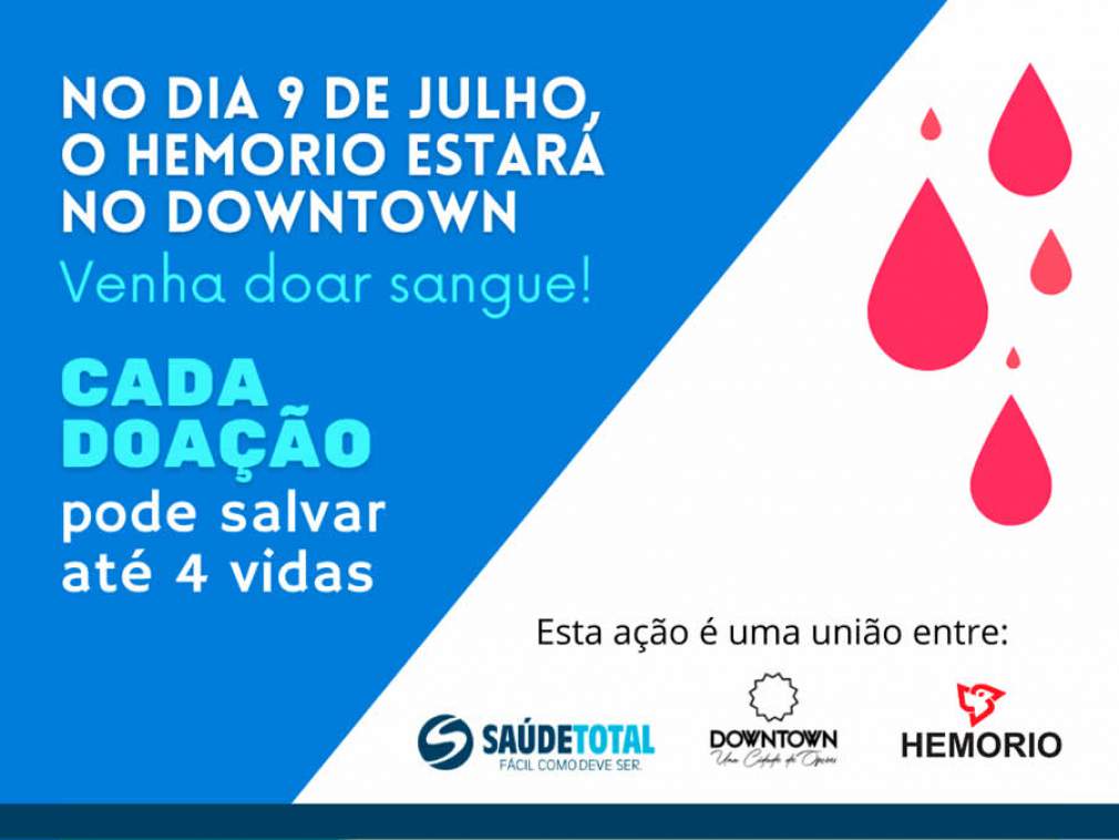 Com a finalidade de iniciar as atividades do Projeto Embaixadores do Bem, a Rede Saúde Total, em parceria com o Hemorio promove uma campanha de doação de sangue, no dia 9 de julho, das 10 horas às 15 horas, no Downtown. Para receber os doadores visando à segurança, o Hemorio estabeleceu um protocolo especial de doadores e colaboradores durante a coleta, com cadeiras de doação espaçadas, disponibilização de antissépticos para as mãos e a intensificação na higienização das superfícies e instrumentos.