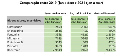 O gasto médio mensal dos aventais aumentou 5.644%, entre a média mensal de 2019 e a dos três primeiros meses de 2021, bem como a quantidade média utilizada por mês, que saltou 726%. O mesmo ocorreu com as máscaras descartáveis, que, em comparação com a média mensal de 2019 e janeiro a março de 2021, apresentou 5.644% de aumento no gasto médio por mês e 654% na quantidade usada mensalmente.