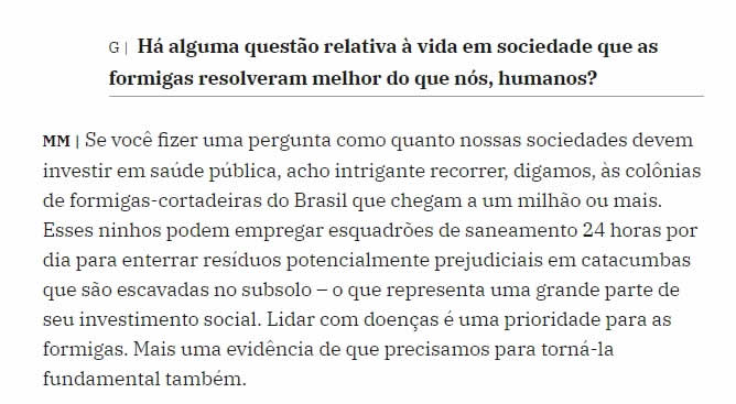 Abaixo, uma das perguntas, falando do que as formigas podem nos ensinar em termos de saúde pública, necessidade urgente em uma época de pandemia.