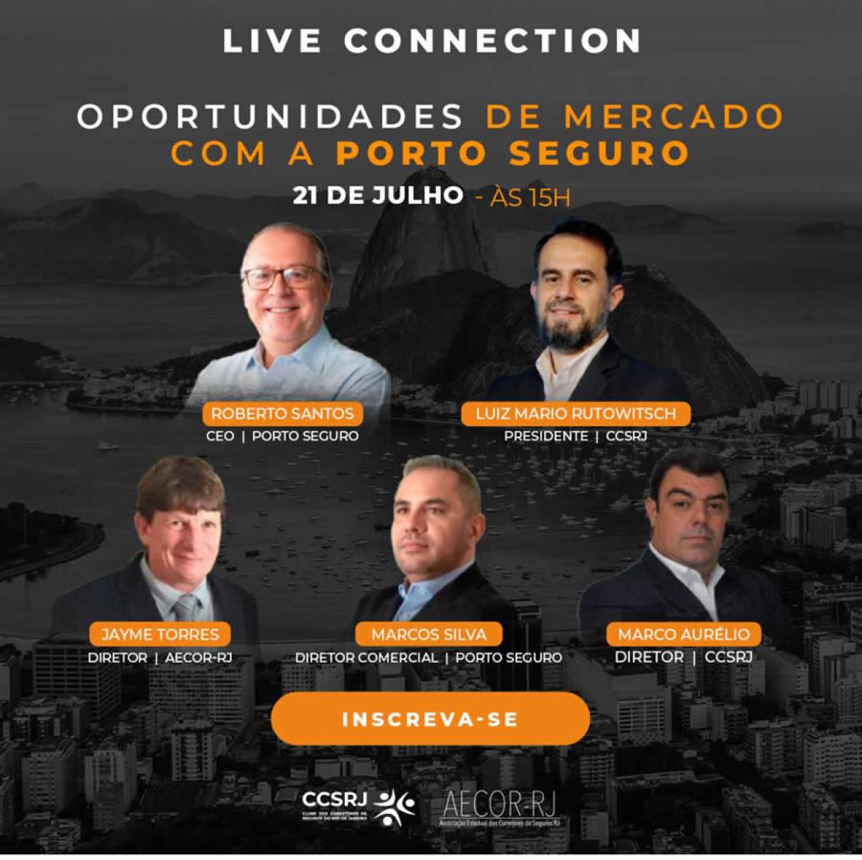 A live de aquecimento para o evento CONNECTION 2021 será no dia 21 de julho, às 15h, com a participação especial dos principais executivos da Porto Seguro: CEO Roberto Santos e o diretor comercial, Marcos Silva. A mediação do debate estará a cargo de Luiz Mário Rutowitsch, presidente do CCS-RJ, em parceria com Jayme Torres, diretor da AECOR-RJ, e Marco Aurélio Marques, diretor do CCS-RJ.