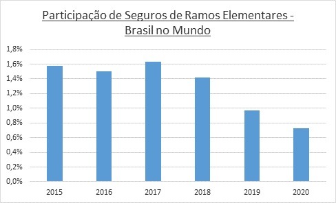 A seguir, gráfico com o cálculo da participação do seguro de ramos elementares no Brasil em relação ao valor mundial.