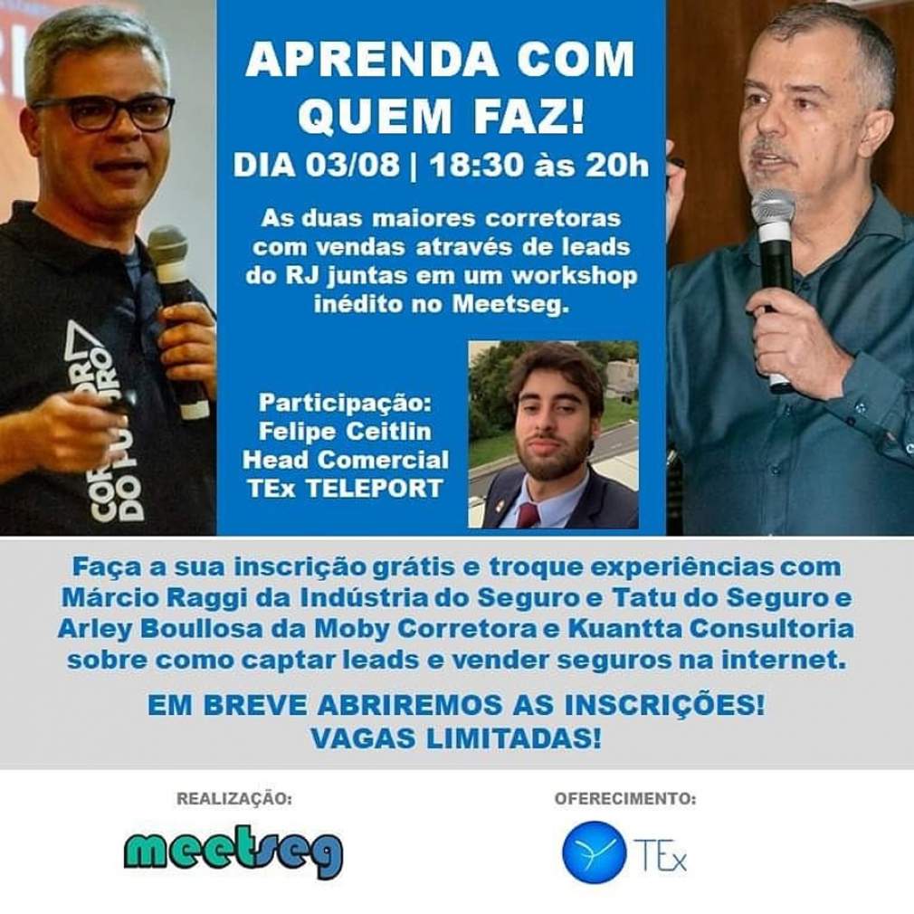 Com a pandemia e o processo de aceleração da transformação no ambiente digital, a venda de seguros pela internet está cada vez mais constante. Com objetivo de expandir os conhecimentos no que se refere a venda de seguros pela internet, o fundador do Meetseg, Arley Boullosa, realiza um workshop sobre venda de seguros através de leads no dia 03 de agosto, às 18h30min, que conta com a participação do Fundador da Indústria do Seguro e da Tatu do Seguro, Marcio Raggi e do Head Comercial Tex Teleport, Felipe Ceitlin. As inscrições podem ser feitas através do Whatsapp (21) 9137-2357.