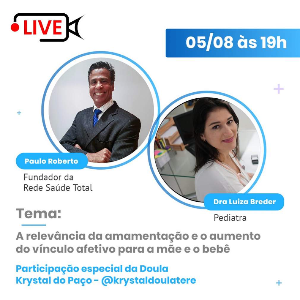 Com objetivo de dar continuidade ao Talk Show sobre saúde e divulgar as ações do Projeto Embaixadores do Bem, que apóia o Agosto Dourado, a Rede Saúde Total realiza uma nova transmissão no dia 5 de agosto, às 19 horas, com o tema “A relevância da amamentação e o aumento do vínculo afetivo para a mãe e o bebê”. Com apresentação do Fundador da Rede Saúde Total, Paulo Ribeiro o evento conta com a participação da Pediatra Dra Luiza Breder e da Doula, Krystal do Paço. Para assistir, é só acessar o @redesaudetotal, no Instagram.