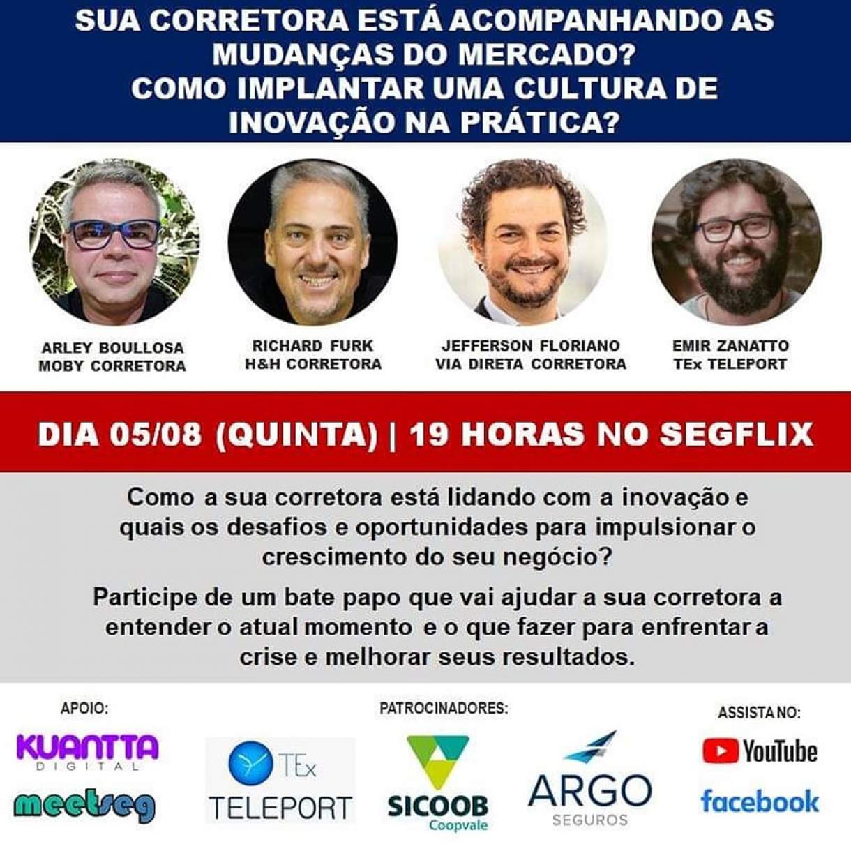 A Kuantta Consultoria promove uma transmissão online que acontece no dia 05 de agosto, às 19 horas no canal SEGFLIX, no YouTube, com o tema “Sua corretora está acompanhando as mudanças? Como implantar uma inovação na prática?”. Com apresentação do Fundador do Canal SEGFLIX e Sócio da Moby Corretora de Seguros, o evento conta com a participação do fundador da H&H Corretora de Seguros e do Projeto Mentor do Corretor, Richard Furck, do CEO da Via Direta Corretora de Seguros, Jefferson Floriano e do Sócio e COO da Tex TELEPORT, Emir Zanato. . A transmissão será veiculada no Canal SEGFLIX, no YouTube, através o https://www.youtube.com/channel/UCA_C3Qw1MOihmfDseRvbrSg