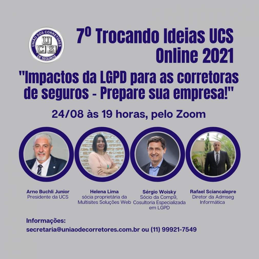 Para oferecer orientações sobre o tema, a UCS realiza no dia 24 de agosto, próxima terça-feira, a partir das 19 horas, seu 7º Trocando Ideias de 2021, com o tema: “LGPD e o impacto para os Corretores de Seguros”. Três especialistas irão esclarecer todas as dúvidas dos corretores de seguros associados: Helena Lima, sócia proprietária da Multisites Soluções Web; Rafael Sciancalepre, diretor da Admseg Informática; e Sergio Woisky, sócio da Comp9, consultoria especializada em LGPD.