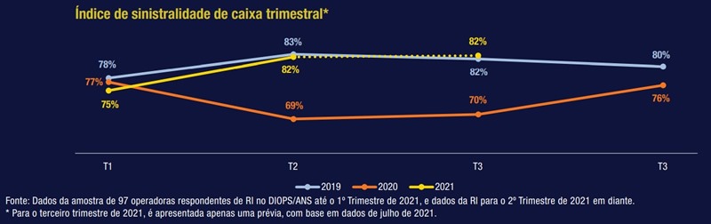 A sinistralidade no segundo trimestre do ano e a projeção para este terceiro trimestre ficam em 82%, sete pontos percentuais a mais que o primeiro trimestre. Assim, o índice se iguala ao terceiro trimestre de 2019 (pré-pandemia).
