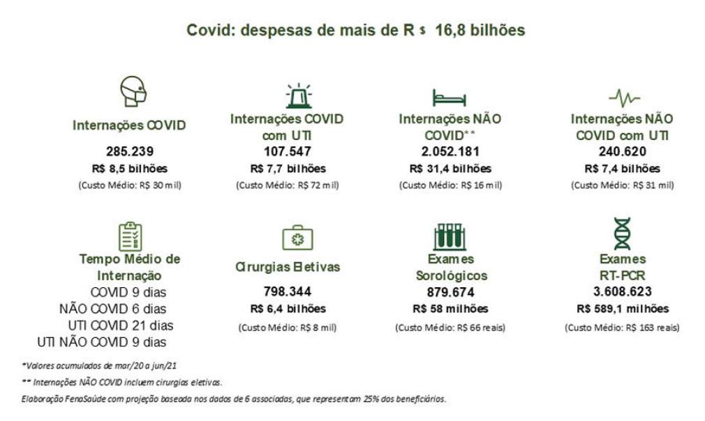A FenaSaúde (que representa os 15 maiores grupos de planos médicos e exclusivamente odontológicos do país) fez um levantamento sobre o quanto essas operadoras já investiram para custear o tratamento de Covid para seus beneficiários, de março de 2020 até junho deste ano. São R﹩ 16,8 bilhões pagos a hospitais, laboratórios e profissionais de saúde somente com exames de Covid e internações hospitalares (com ou sem necessidade de UTI).