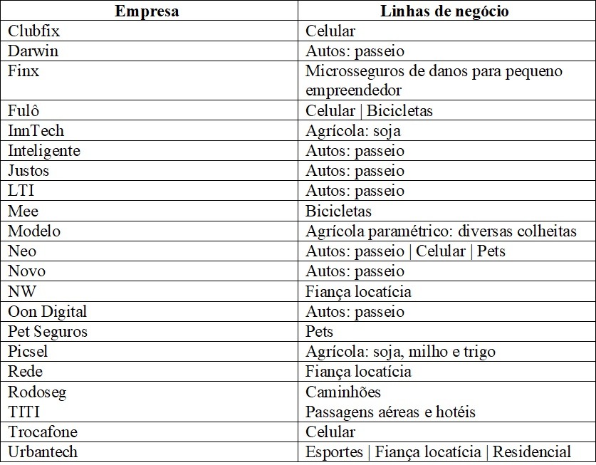 As seguradoras que entrarão em operação a partir dos projetos selecionados terão autorização temporária para atuação por até três anos dentro do modelo Sandbox. Abaixo, a lista dos participantes selecionados (ordem alfabética):