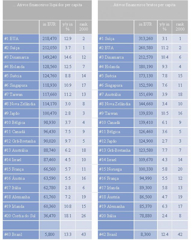 O crescimento do passivo foi de 11,2%, contra um aumento médio de 10,4% na década anterior. À medida que a produção econômica desacelerou em 2020, a taxa da dívida (passivos em % do PIB) saltou para 18%, um nível bem abaixo da média latino-americana (32%) ou de outros mercados emergentes como o Leste Europeu (26%) – e definitivamente bem abaixo da Ásia (ex: Japão), onde a taxa média da dívida é de 61%. Por fim, o ativo financeiro líquido cresceu 14,1%. Com ativos financeiros líquidos per capita de 5.800 euros, o Brasil caiu para o 43º lugar no ranking dos países mais ricos (ativos financeiros per capita, ver tabela dos 20 primeiros). Com isso, o Brasil fica abaixo da Rússia (42º) e do México (41º), e bem abaixo da China (34º). Como muitos países europeus, como Itália, França, Bélgica ou Grã-Bretanha caíram drasticamente no ranking desde 2000, o top10 parece diferente hoje do que em 2000: tornou-se mais uma questão escandinava-asiática – mas com os EUA e a Suíça ainda reinando supremos.