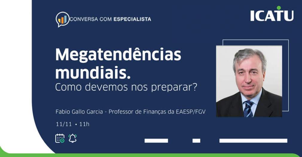 A pandemia chegou acelerando tendências que já estavam surgindo no campo econômico, social e comportamental e fez com que as pessoas se preocupassem ainda mais com o futuro. Para fazer uma análise completa deste atual cenário, no 'Conversa com Especialista' desta quinta-feira, 11 de novembro, às 11h, a Icatu recebe o professor de Finanças da FGV, Fábio Gallo. No bate-papo, 'Megatendências Mundiais: Como devemos nos preparar?', o professor também falará sobre o que está por vir e quais são as apostas e próximas tendências de mercado. A ideia é que o público possa ter dados e base para se planejar para esse futuro que já está em curso.
