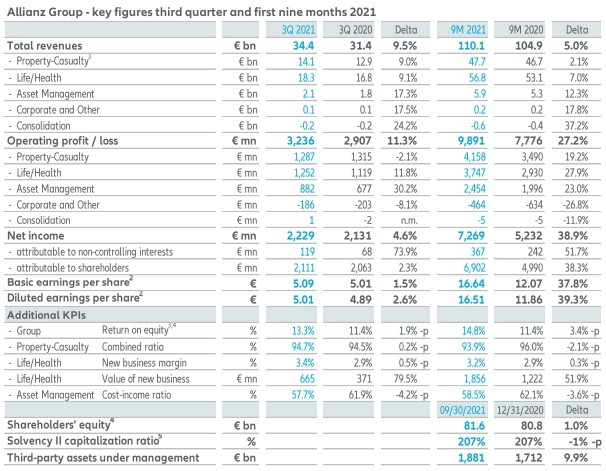O lucro operacional aumentou 30,2%, indo para 882 (677) milhões de euros no terceiro trimestre de 2021, comparado ao mesmo período do ano anterior. O crescimento das receitas se deve principalmente à média mais elevada nos ativos de terceiros sob gestão (AuM) e contou com o apoio adicional da integração da Allianz Real Estate. Com as correções por efeitos de transposição cambial, o lucro operacional aumentou 31%. A relação custo-rendimento (CIR) melhorou em 4,2%, indo para 57,7% no terceiro trimestre de 2021, comparado ao terceiro trimestre de 2020.
