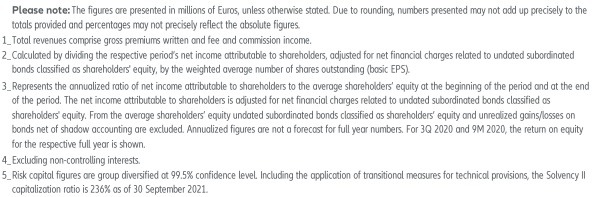 • Lucro líquido atribuível aos acionistas nos primeiros 9 meses de 2021 cresce 38,3% e vai a 6,9 bilhões de euros