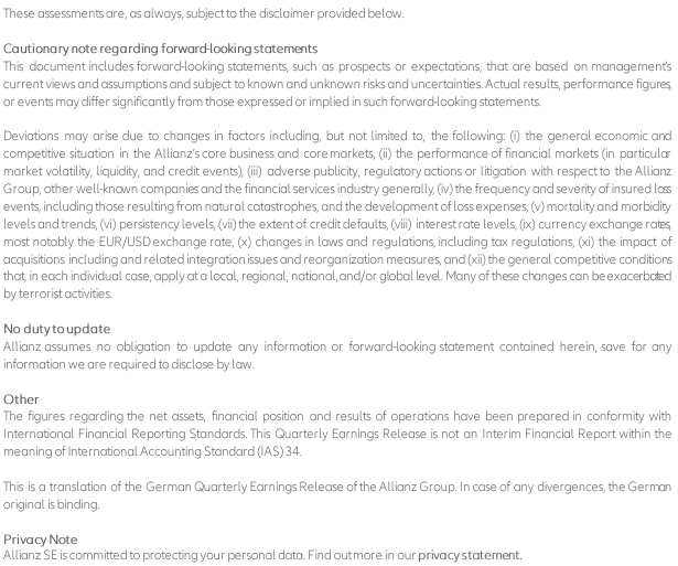 [2] Como sempre, catástrofes naturais e desdobramentos adversos nos mercados de capital, bem como fatores que constam da nossa nota de advertência a respeito de declarações de previsão podem afetar severamente o lucro operacional e/ou o lucro líquido de nossas operações e os resultados do Grupo Allianz.